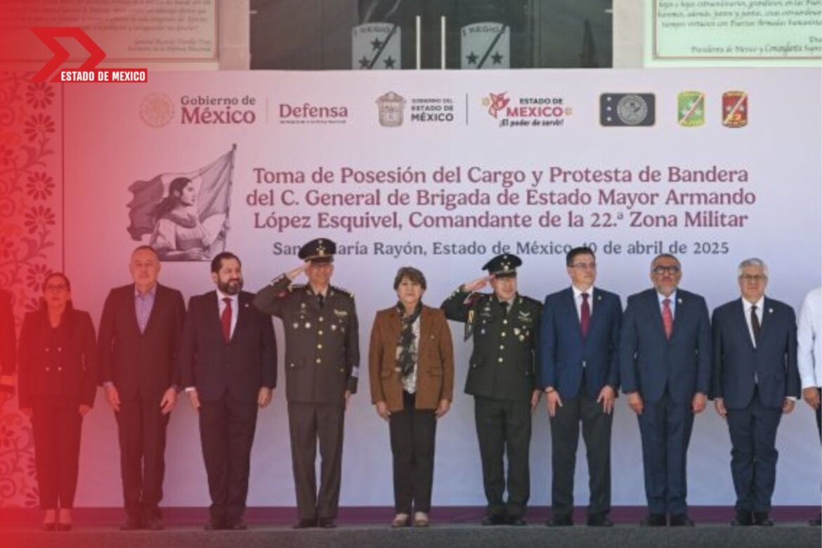 La Gobernadora del Estado de México, Delfina Gómez Álvarez, presidió la ceremonia oficial de toma de posesión y protesta de bandera del General de Brigada Diplomado de Estado Mayor, Armando López Esquivel, quien asumió el mando de la 22/a Zona Militar, ubicada en Santa María Rayón.